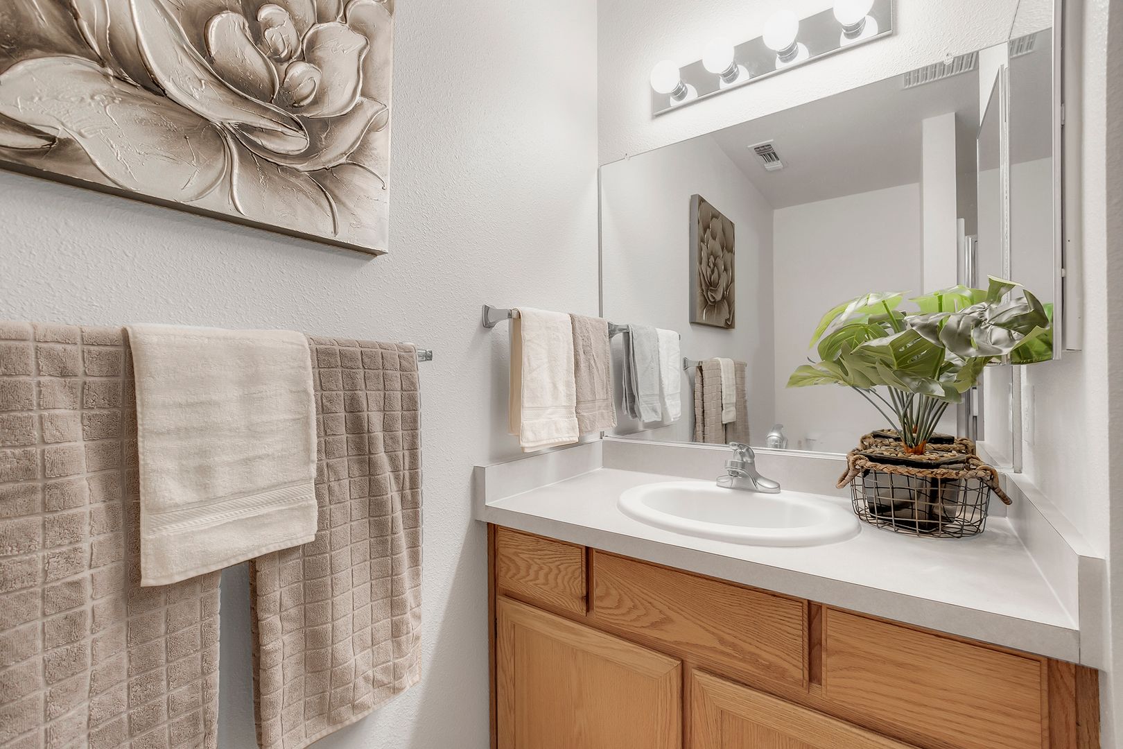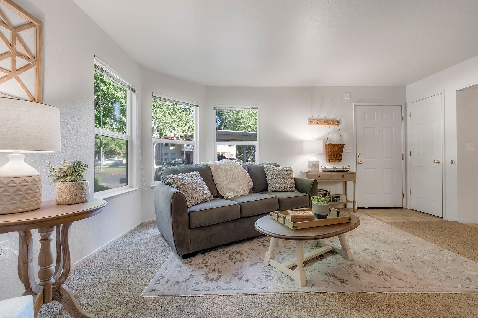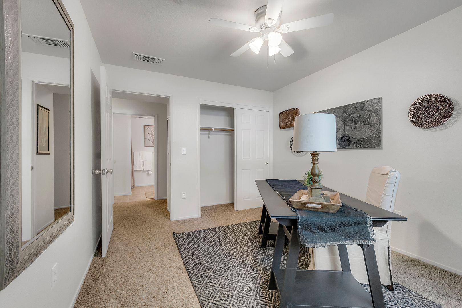The three bedroom, two bath apartment at Mission Ranch features an entry porch and private patio. The full size washer and dryer are in the laundry area off of the dining room for ease of use. The kitchen includes an 18 cu ft frost free refrigerator, ice maker, garbage disposal, double sinks, dishwasher, microwave shelf, pantry - and there is a ceiling fan in the dining room. You'll love the elegant oak cabinetry and two spacious linen closets.