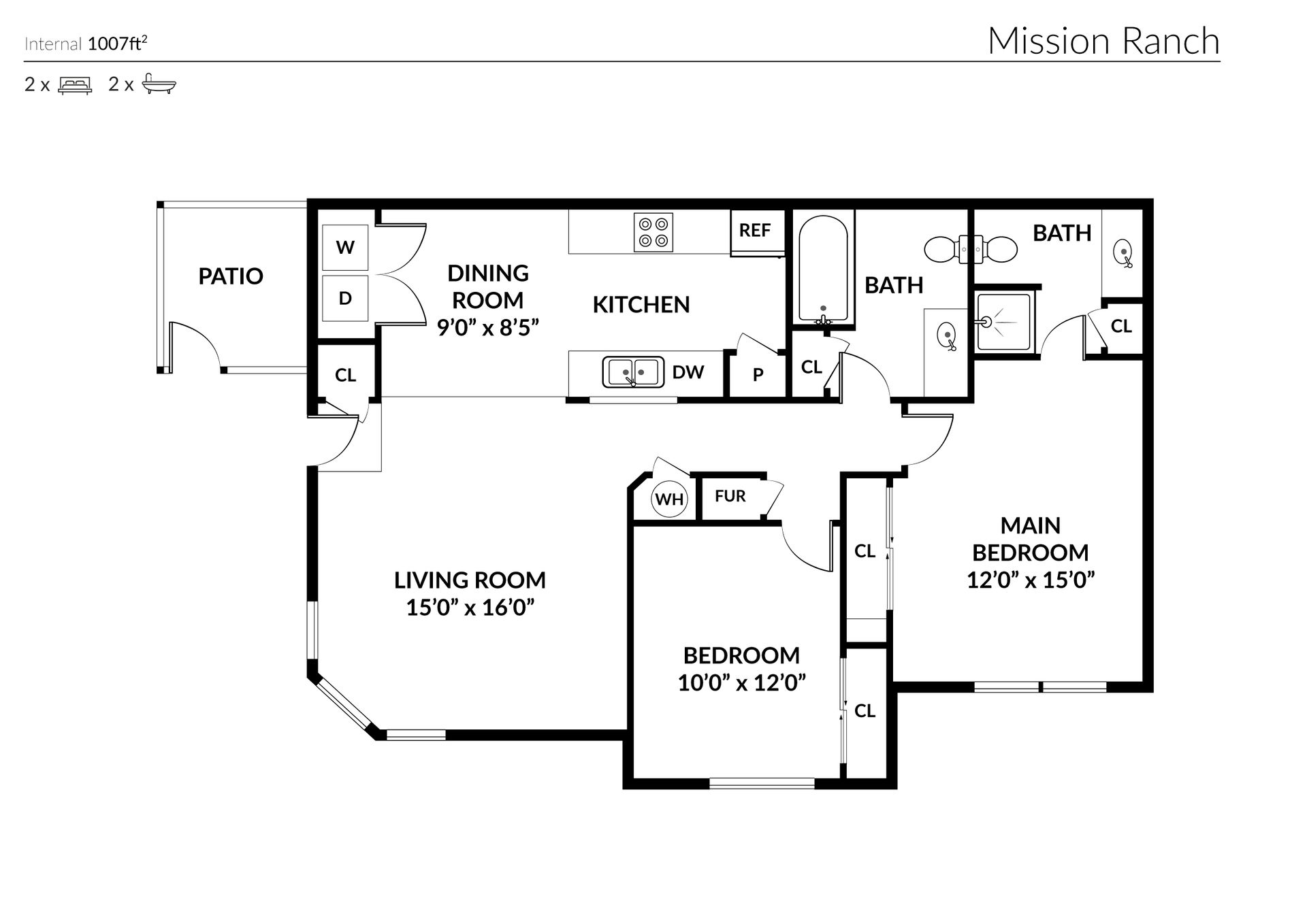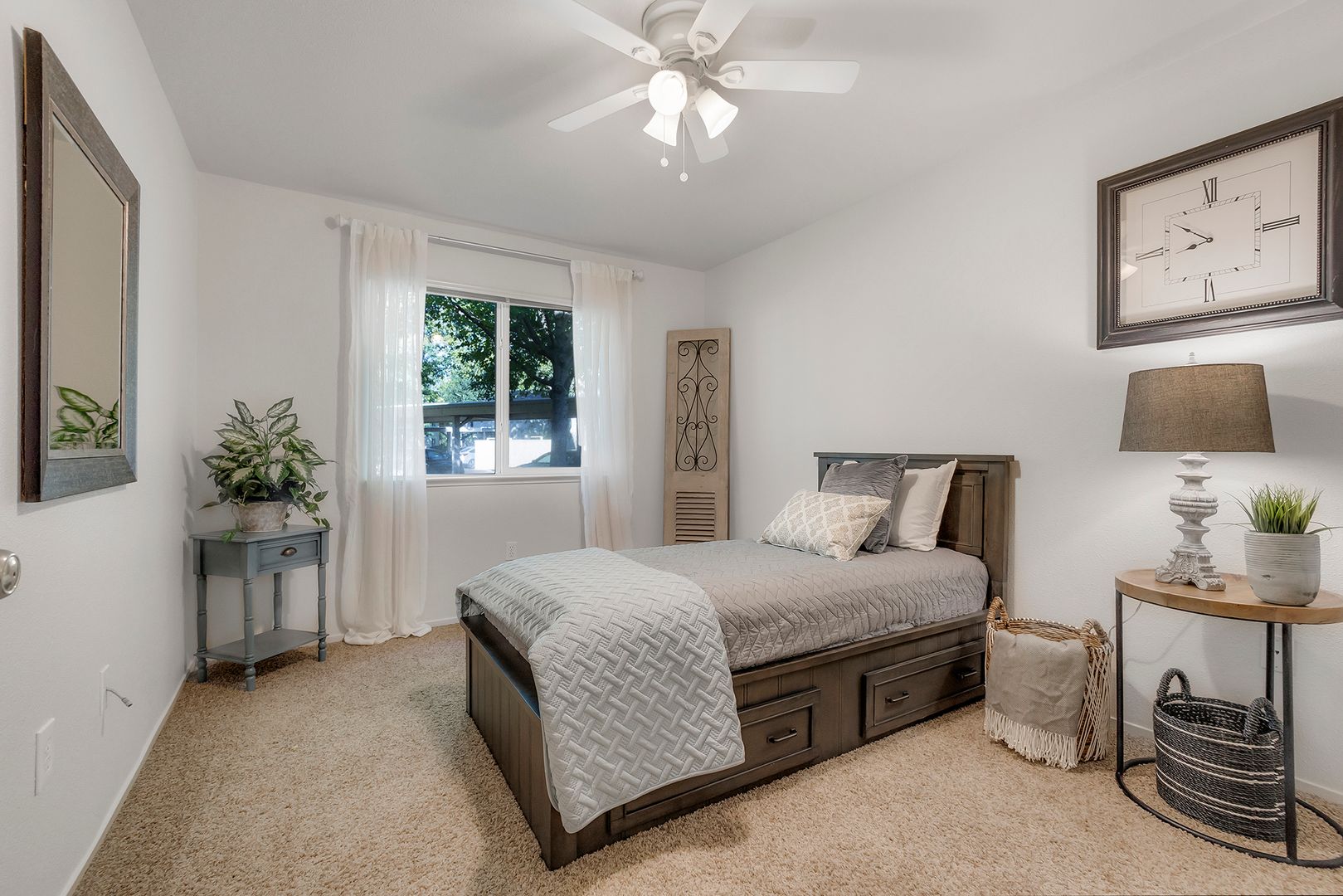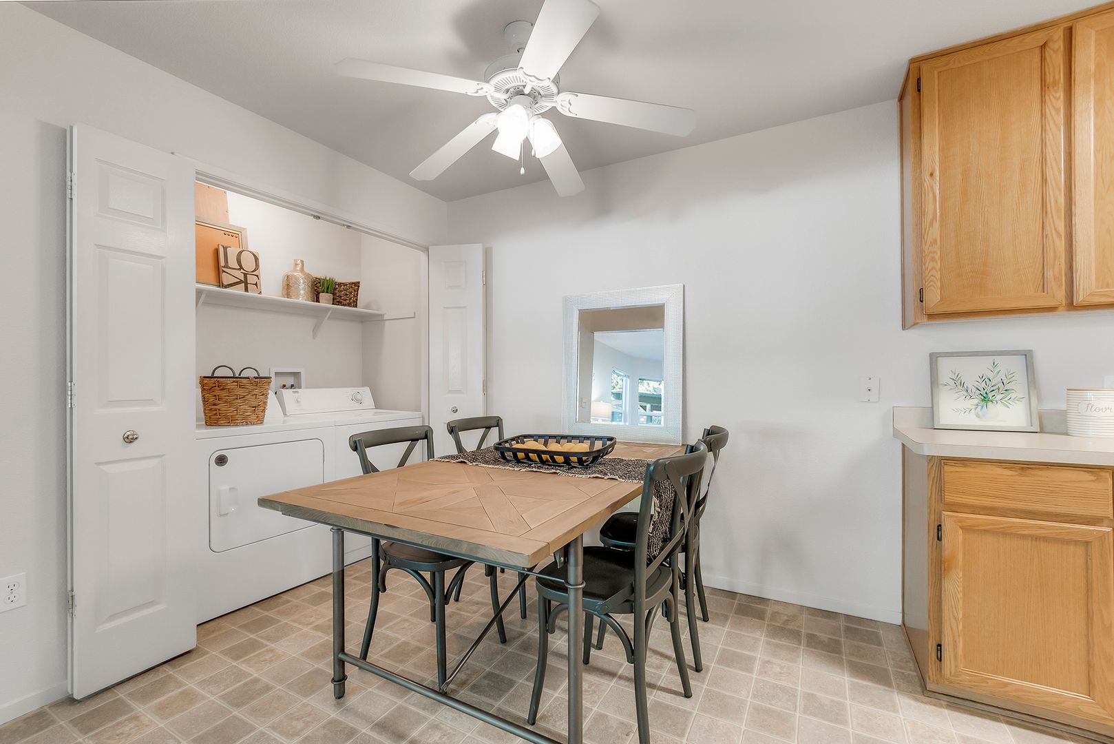 The two bedroom, two bath pet friendly apartment at Mission Ranch features an entry porch and private patio. The washer and dryer are in the laundry area off of the dining room for ease of use. The kitchen includes an 18 cu ft frost free refrigerator, ice maker, garbage disposal, double sinks, dishwasher, microwave shelf, pantry - and there is a ceiling fan in the dining room. You'll love the elegant oak cabinetry and the spacious linen closet. The main bedroom is spacious and has a ceiling fan for your comfort. The second bedroom is large and ready for your furnishings.